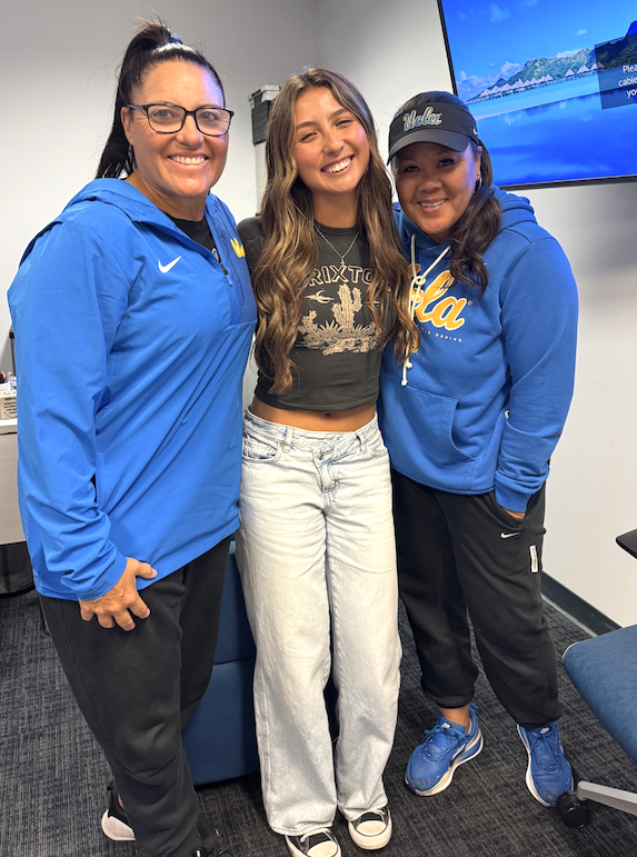 Ava (center) with UCLA coaches Lisa Fernandez and Kelly Inouye-Perez earlier this month when the 2026 grad committed to the Bruins.