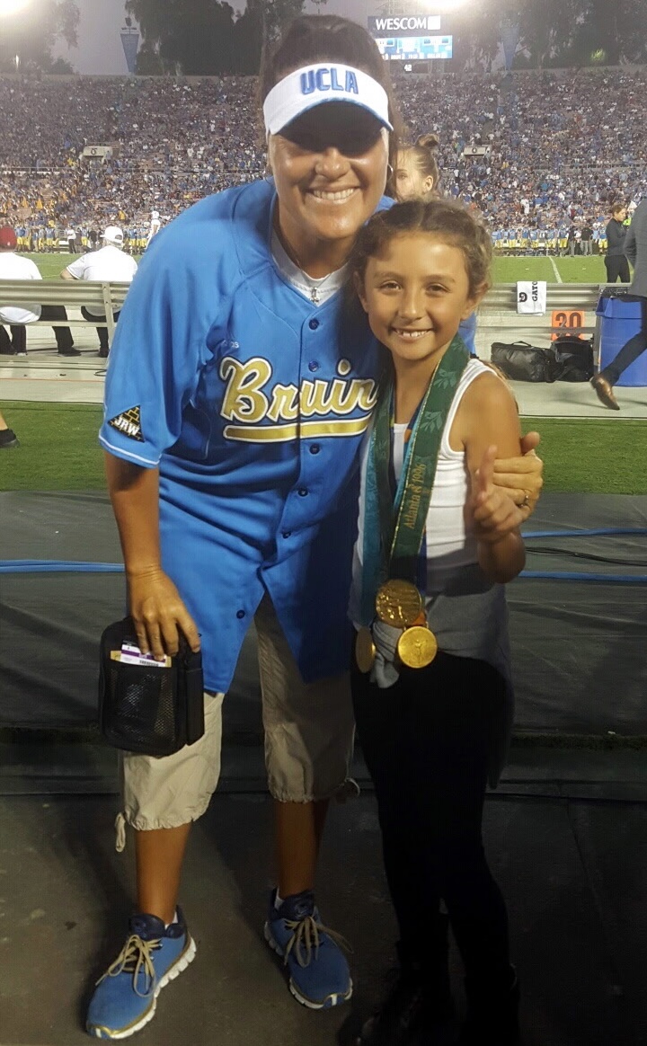 Ava at the UCLA game where she had her picture taken with Coach Lisa and got to wear the Olympic medals!