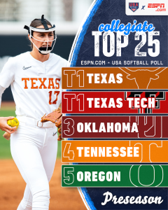 As the 2026 season begins, Texas and Texas Tech sit atop the Preseason ESPN.com/USA Softball Collegiate Top 25 Poll, tied at No. 1.