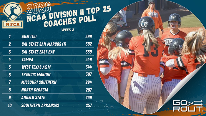 The 2026 NFCA/GoRout Division II Top 25 Coaches Poll is voted on by the NFCA Division II Top 25 Poll Committee. The committee consists of 16 NCAA Division II head coaches with two representing each of the NCAA’s eight regions. The poll is announced every Tuesday at noon ET during the regular season. Records reflect games played through Feb. 15, 2026.