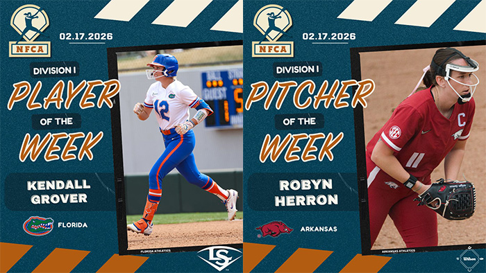 Florida’s Kendall Grover and Arkansas’ Robyn Herron were named Division I Louisville Slugger/NFCA Player and Wilson/NFCA Pitcher of the Week honors for contests played Feb. 9-15.