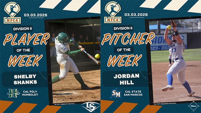 Cal Poly Humboldt’s Shelby Shanks and Cal State San Marcos’ Jordan Hill collected Division II Louisville Slugger/NFCA Player and Wilson/NFCA Pitcher of the Week honors for contests played Feb. 23-March 1.