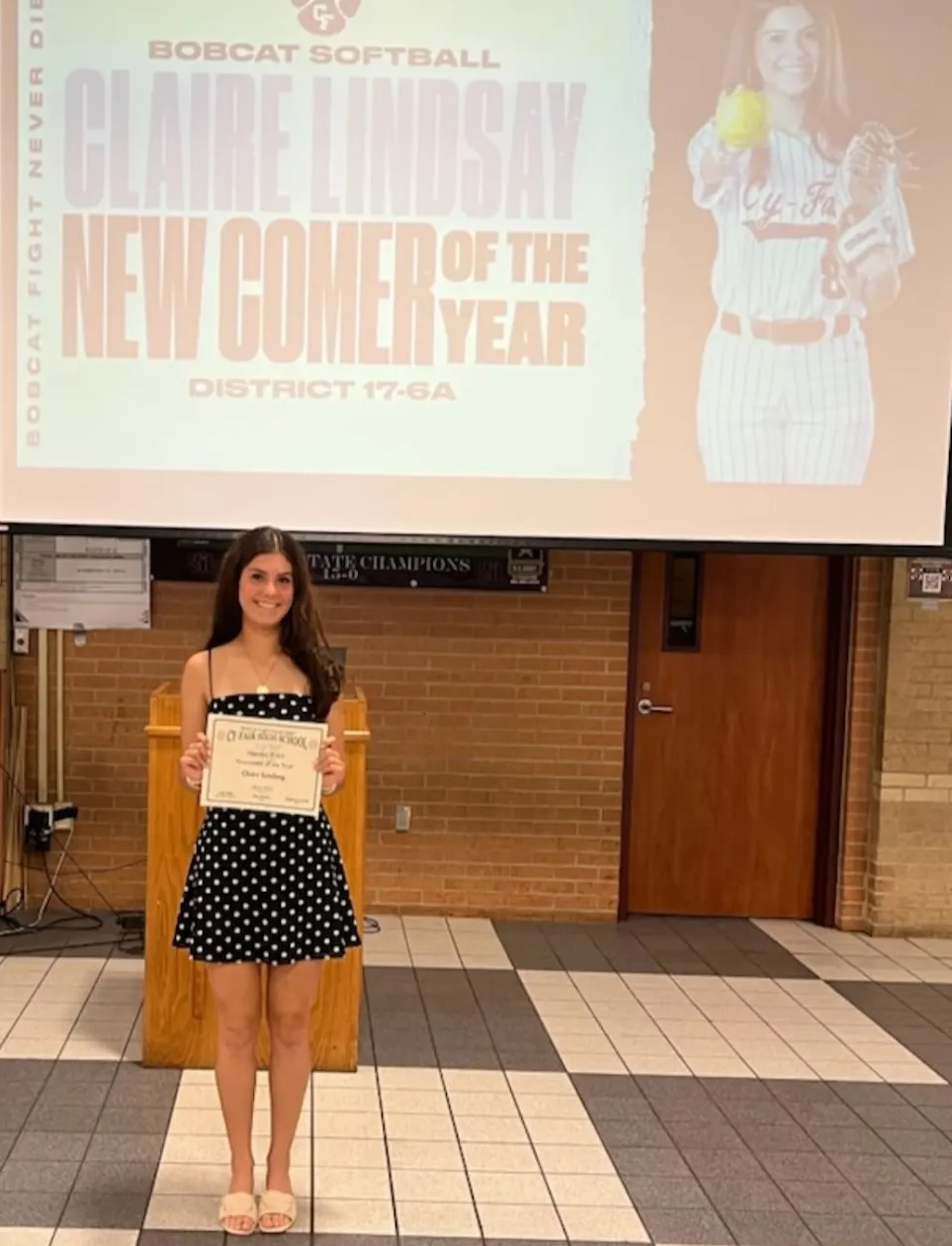 Claire was named the Cy-Fair District 6A-17 Newcomer of the Year as a freshman.