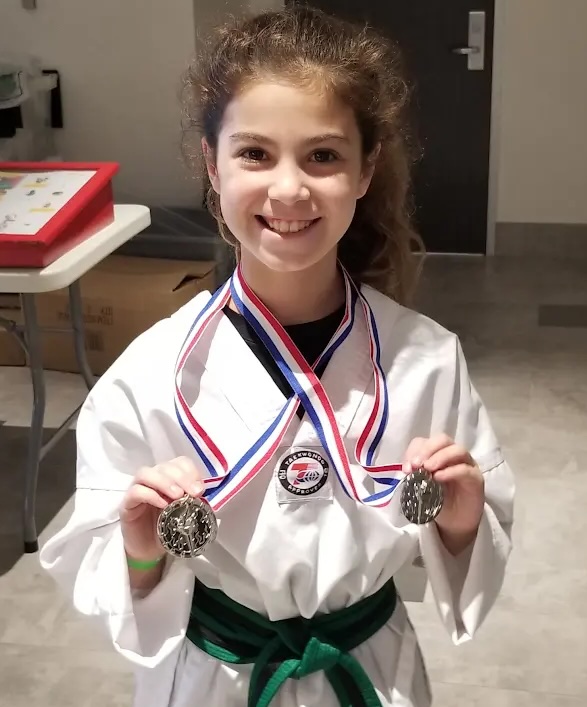 The young athlete proudly showing off some of the medals she won in Taekwondo