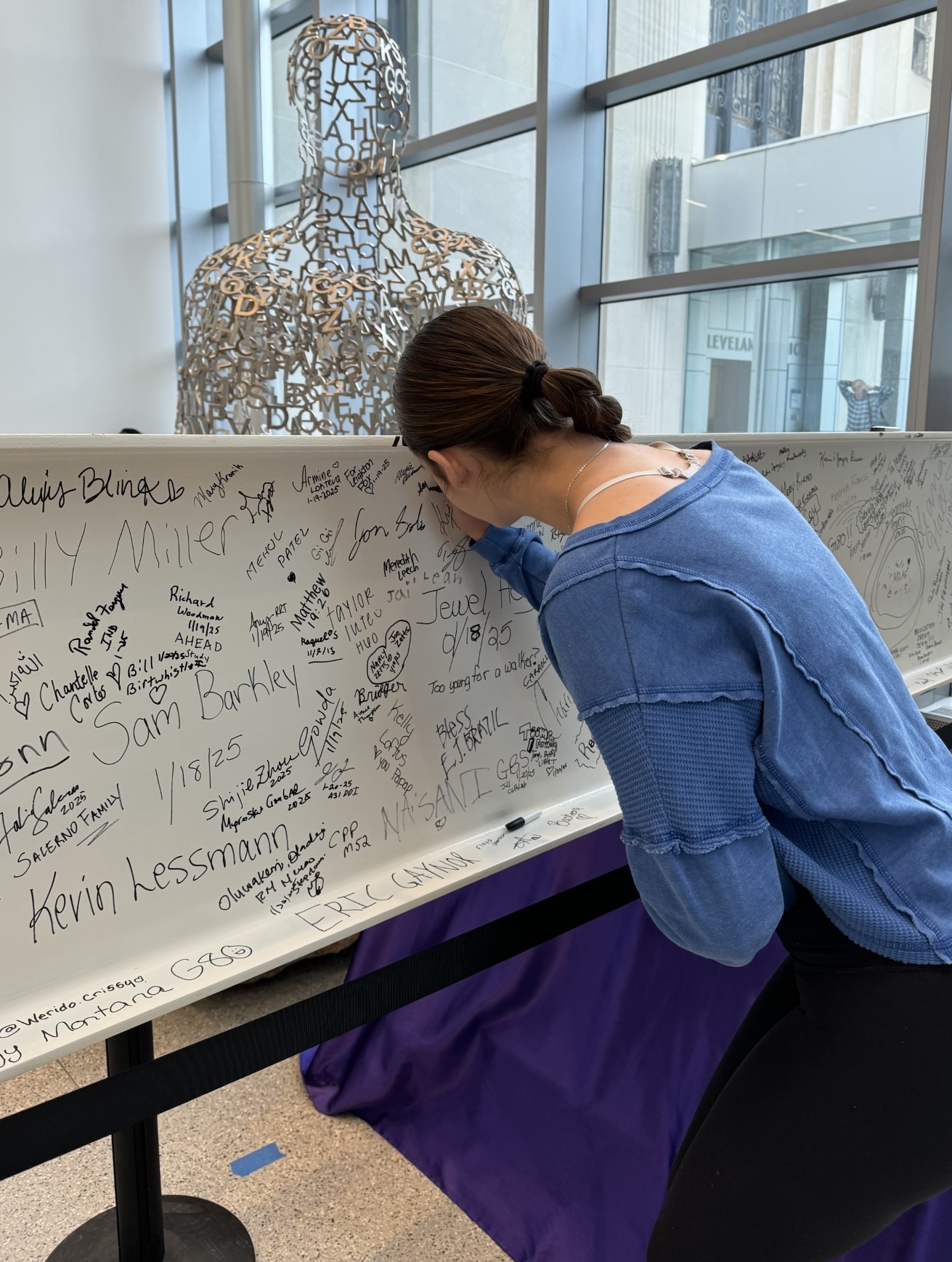 Sophie signs a banner at the Neurological Institute building at the Cleveland Clinic. Attendees are encouraged to sign he beam “If you or a loved one have been impacted (by neurological conditions).”