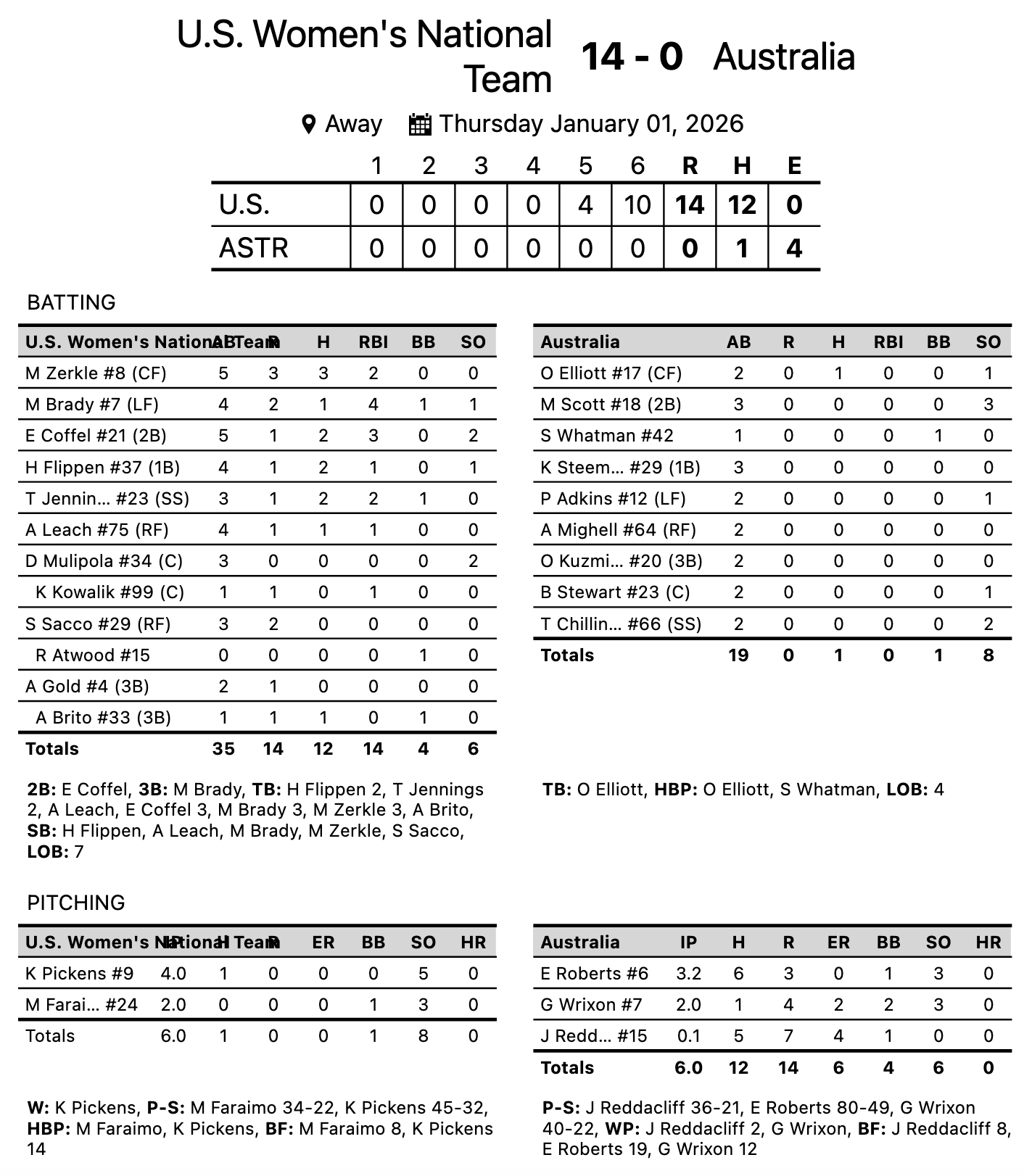 Behind a 10-run sixth inning, Team USA continued its dominance at the 2025 USA Down Under Series with a 14–0 run-rule victory over Australia.
