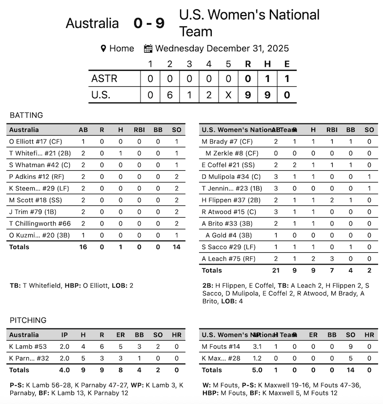 The world-ranked No. 2 U.S. Women’s National Team (WNT) kicked off the USA Down Under Series in dominant fashion with a 9–0 run-rule shutout (five innings) over the No. 10 Aussie Spirit in Brisbane, Australia.