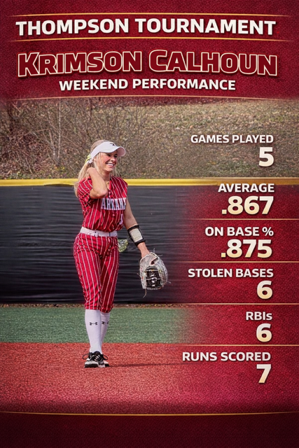 ***Krimson Calhoun, a 2028 middle infielder for Thompson High in Alabaster, Ala., was an offensive hurricane last week as she played in five games and went 13-for-15 for a sizzling .867 batting average.