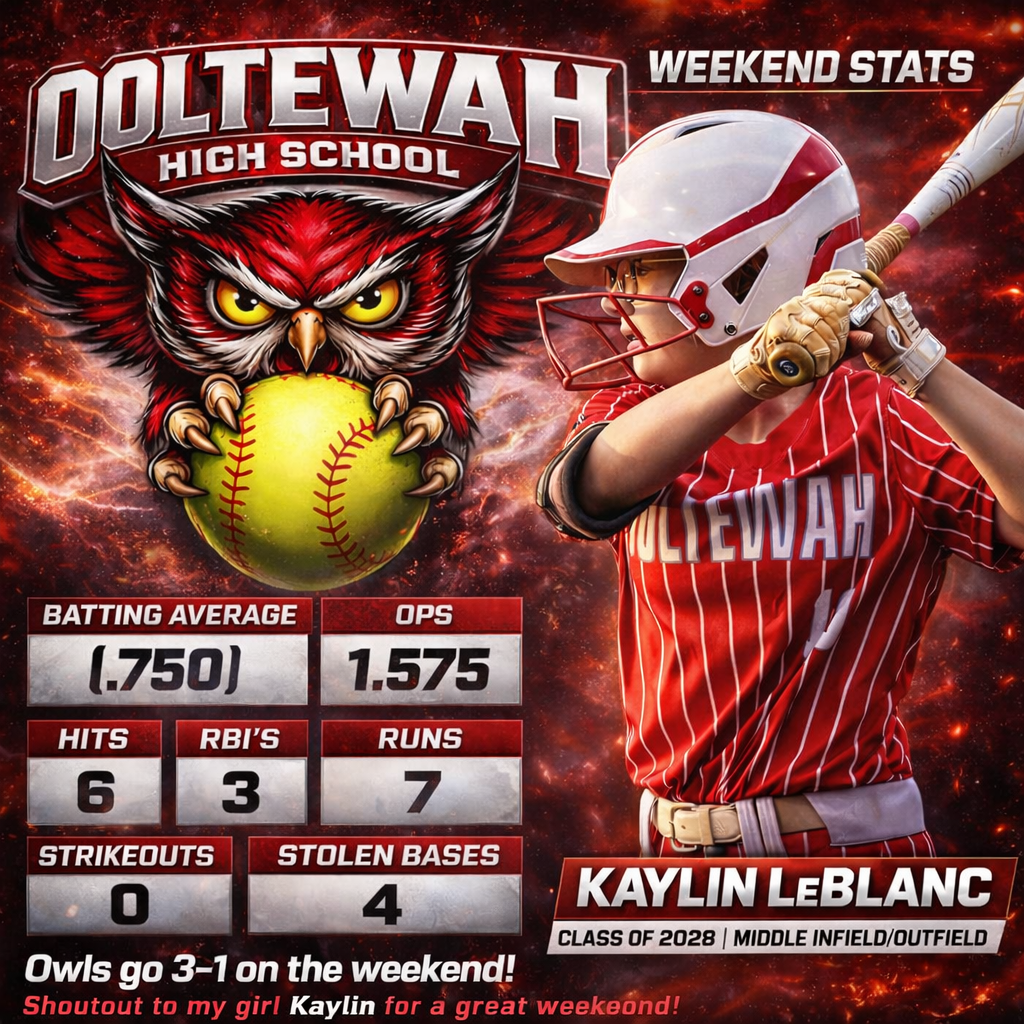 *** Kaylin LeBlanc, a 2028 middle infielder/outfielder for Ooltewah (Tenn.) High, had a weekend to remember as she helped her team go 3-1 in a local tournament as she batted .750 on six hits in eight at-bats.