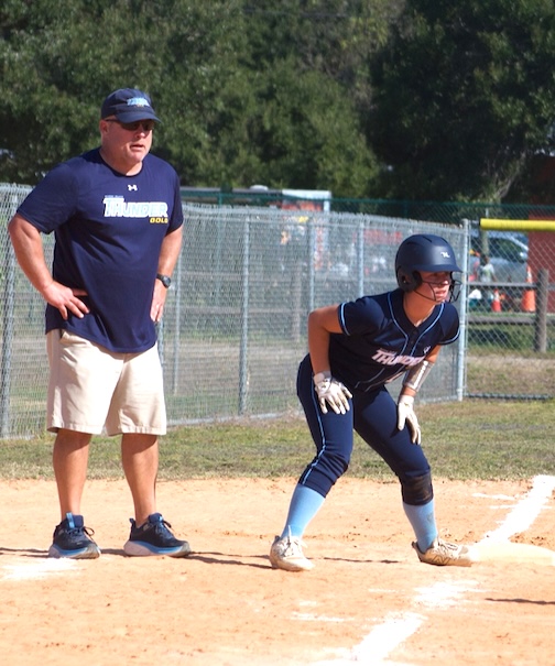 Raegan on third with her father behind her in the coaching box.