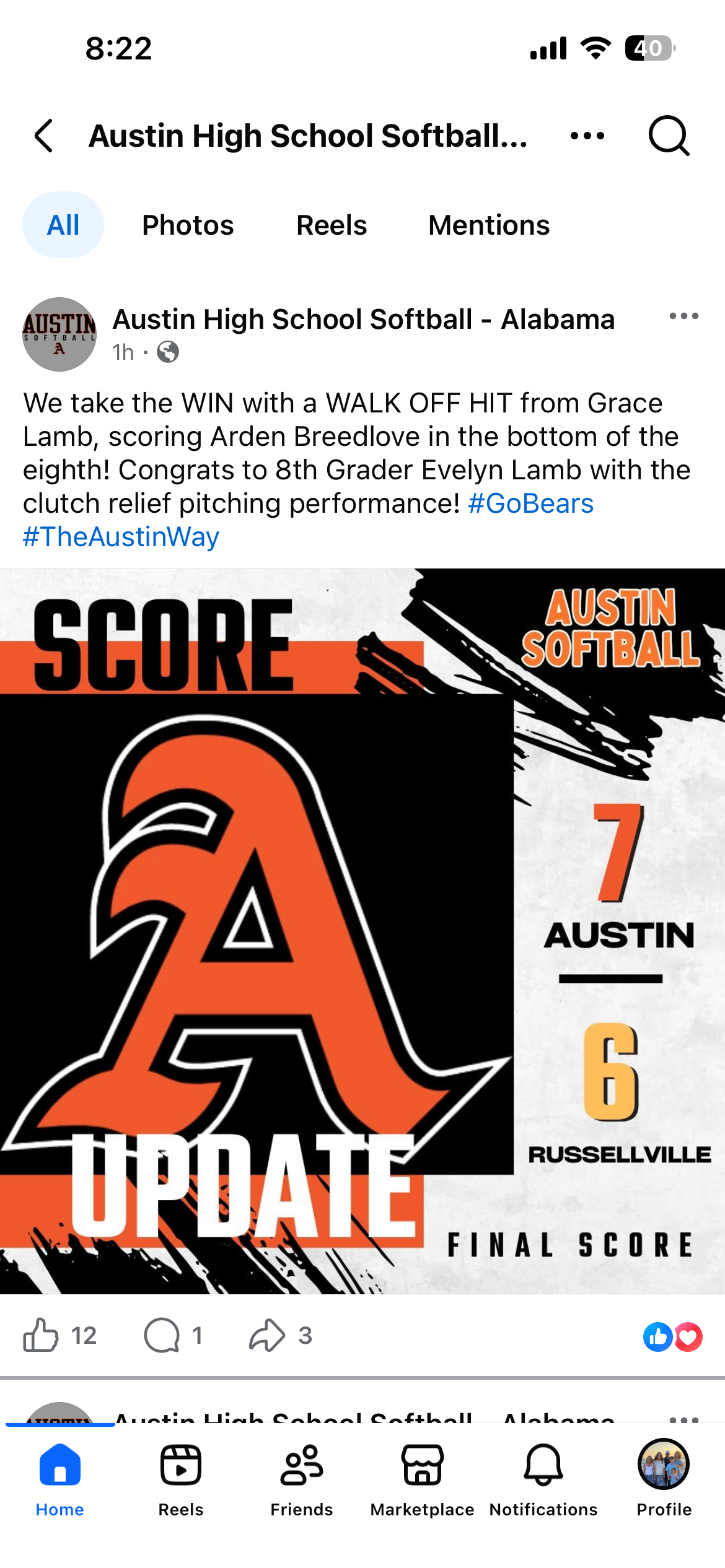 Just a week later, on April 13th, Grace had the walk-off game-winner against Russellville High while Evelyn was pitching.